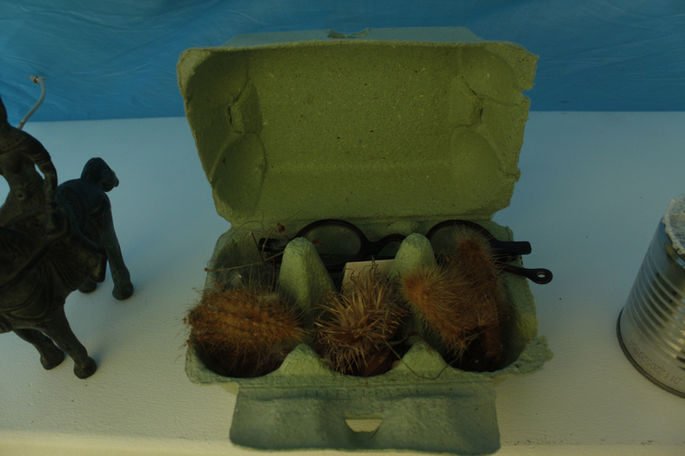 Tent, bouquets collected from souths, cushions, rugs, baskets, hair, artist books, joint butts, bottles, salt, canes, boxes, found statues, amulets from Brazil, hats, beach towels, sisal, experiments & time.