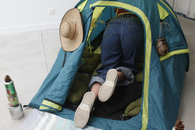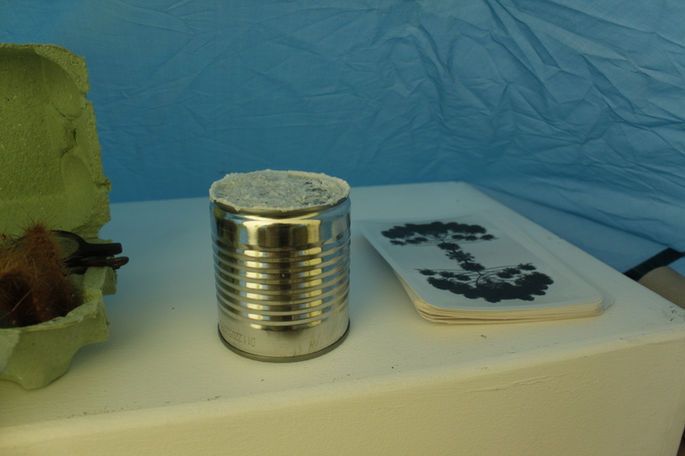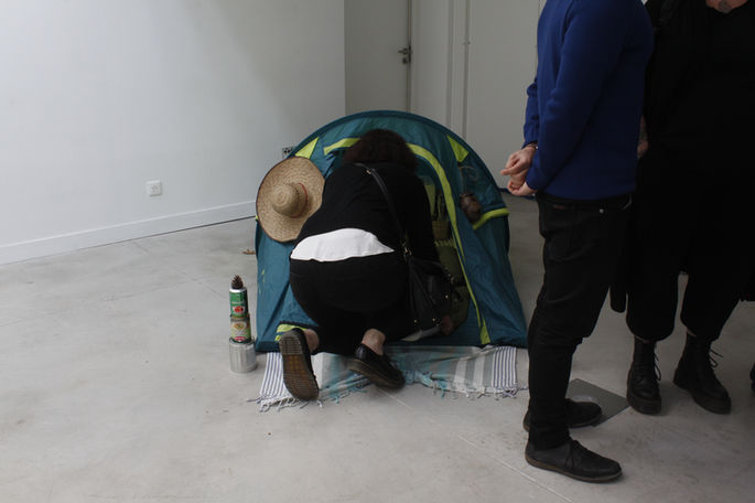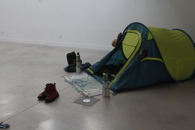 With a Brazilian soundtrack, the tent invites passers-by to enter & discover my universe. There, are organized all my souvenirs and memories related to my stay in France (and people say it smells like a forest). Between materials collected from nature and the human, we see a landscape of this subjective perspective of the world & its different cultures. The tent proposes the mystery of this personal mythology in a new planet.